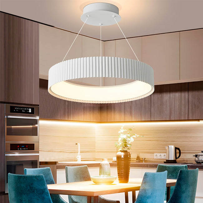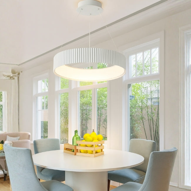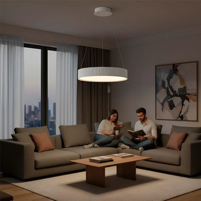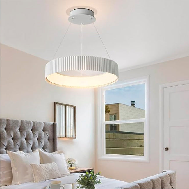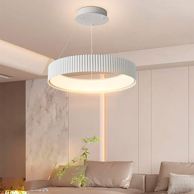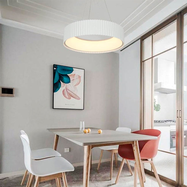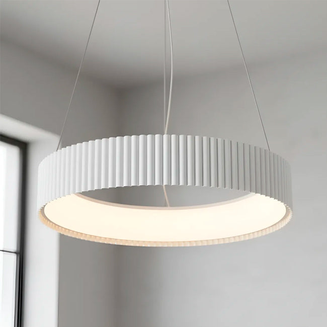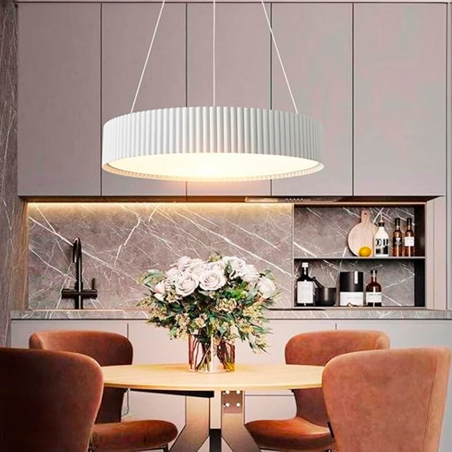 La Lámpara Colgante Barbara LED White redefine la elegancia moderna con su diseño circular de líneas acanaladas y acabado completamente blanco. Ideal para ambientes minimalistas y sofisticados, ofrece una iluminación potente, uniforme y regulable mediante control remoto multifunción, permitiendo adaptar el tono y la intensidad de la luz según el ambiente o momento del día.