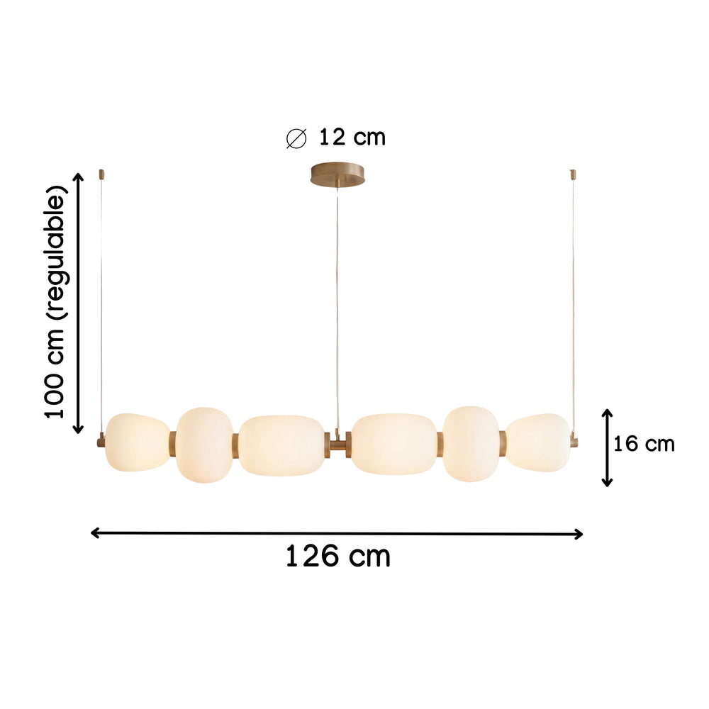 Redefina la elegancia en sus espacios con la Lámpara Colgante Pebble Line. Esta pieza no es solo una luminaria, es una escultura horizontal que fusiona la calidez del acabado en oro cepillado con la suavidad de 6 difusores de vidrio opalizado en formas orgánicas. Su diseño lineal, inspirado en las piedras de río pulidas por la naturaleza, es la elección definitiva para quienes buscan un estilo Japandi o Minimalista Moderno de alto impacto visual.