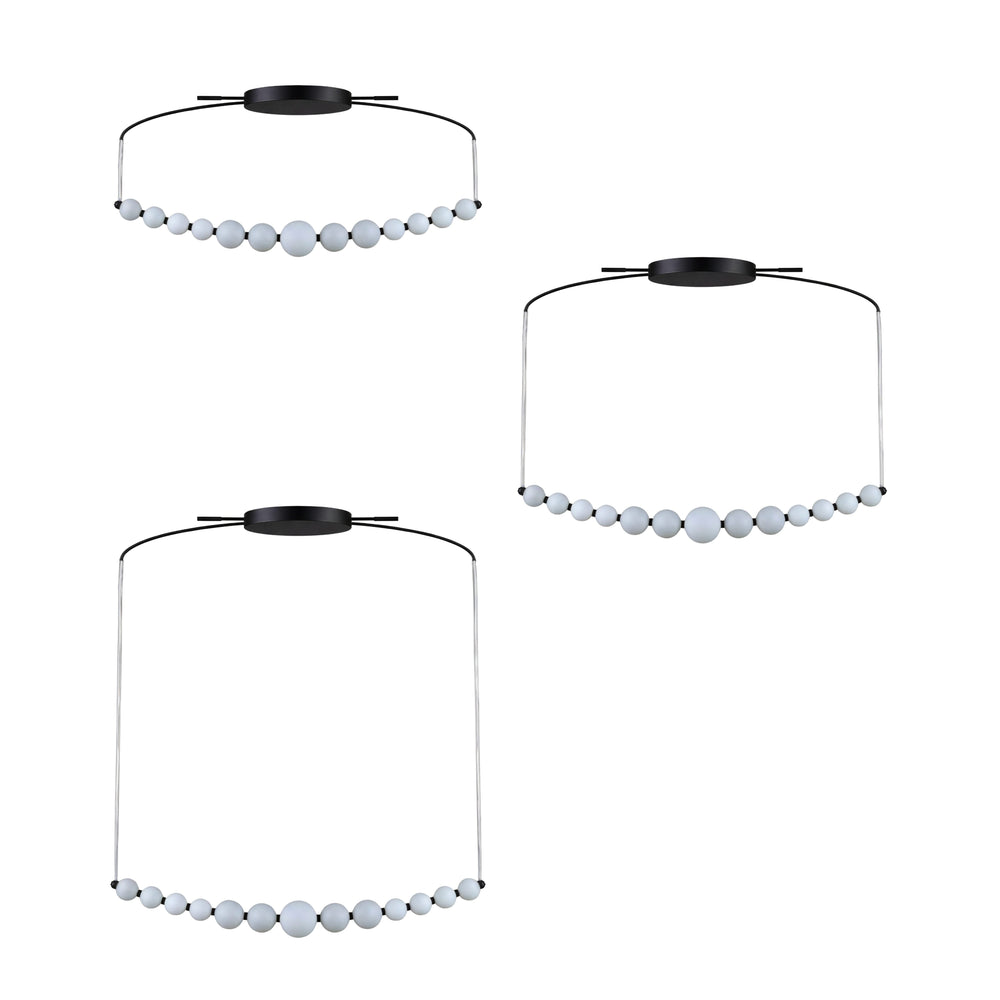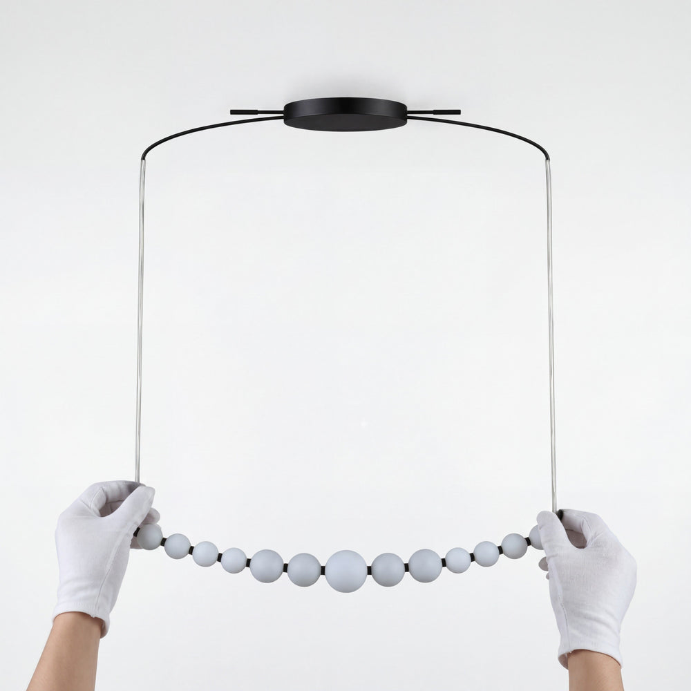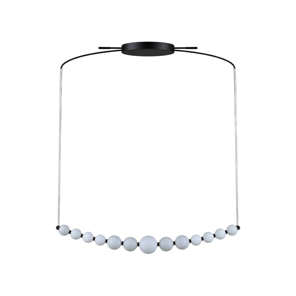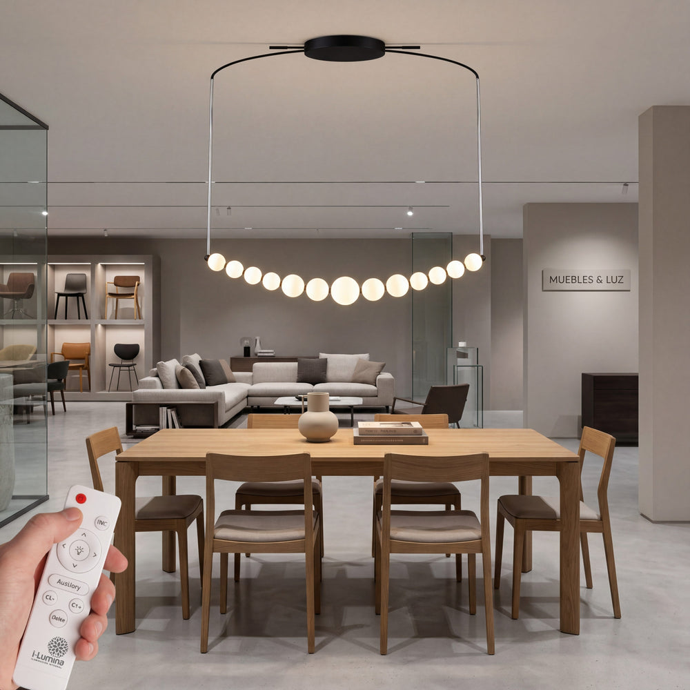 La Lámpara Perla Black es la máxima expresión del minimalismo contemporáneo. Con un diseño inspirado en la caída natural de un collar de perlas, esta pieza combina una estructura curva en negro mate con 13 esferas de plástico opalino que parecen flotar en el aire. Su imponente ancho de 127 cm la convierte en el eje visual de cualquier habitación, ofreciendo una iluminación uniforme, suave y sin deslumbramientos.