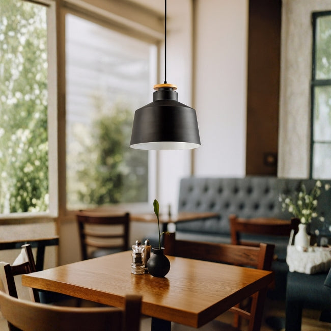La lámpara colgante Francesca Black and Wood de Ecolamps combina líneas simples con un estilo moderno e industrial. Su acabado negro mate con detalle superior en madera natural aporta equilibrio entre elegancia y calidez, ideal para realzar cualquier espacio con un toque contemporáneo. Incluye un foco LED de 12W en luz cálida que brinda una iluminación confortable y acogedora, perfecta para ambientes residenciales o comerciales.