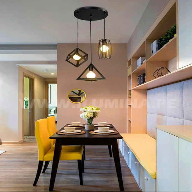 La lámpara colgante Almendra Black Art Deco destaca por su diseño moderno con inspiración geométrica y estilo industrial contemporáneo. Sus tres pantallas metálicas en formas distintas crean una composición visual equilibrada y elegante, ideal para dar carácter y dinamismo a espacios como comedores, barras de cocina o salas modernas.