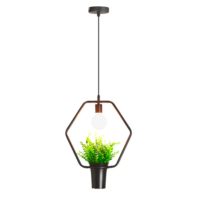 La lámpara colgante Amelia Black Garden destaca por su original diseño hexagonal que combina iluminación decorativa con un toque natural. Su estructura metálica negra integra un macetero en la parte inferior, permitiendo colocar plantas decorativas o artificiales que aportan frescura y estilo al ambiente. Ideal para quienes buscan una luminaria moderna con detalles orgánicos y estéticos.