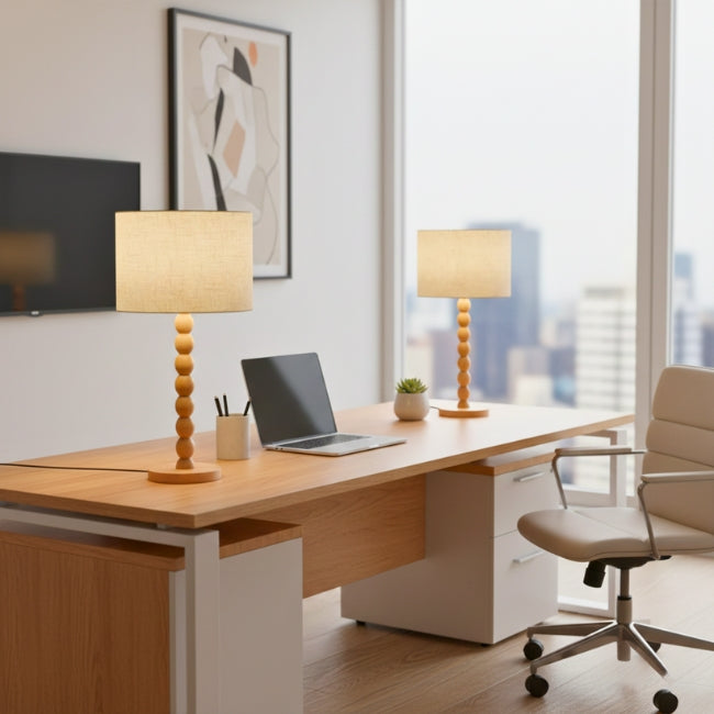 La Lámpara de Mesa Wood Bubbles Boho Natural de ILUMINA es un accesorio decorativo imprescindible para inyectar un estilo boho chic y acogedor a cualquier superficie en Perú. Al igual que su versión de pie, presenta una base distintiva de esferas apiladas de madera natural, rematada con una pantalla cilíndrica de tela en tonos neutros. Es perfecta para crear una luz de ambiente cálida sobre mesas auxiliares, cómodas o escritorios, añadiendo una textura orgánica y artesanal.