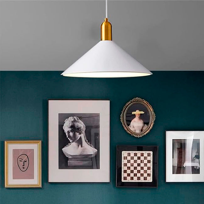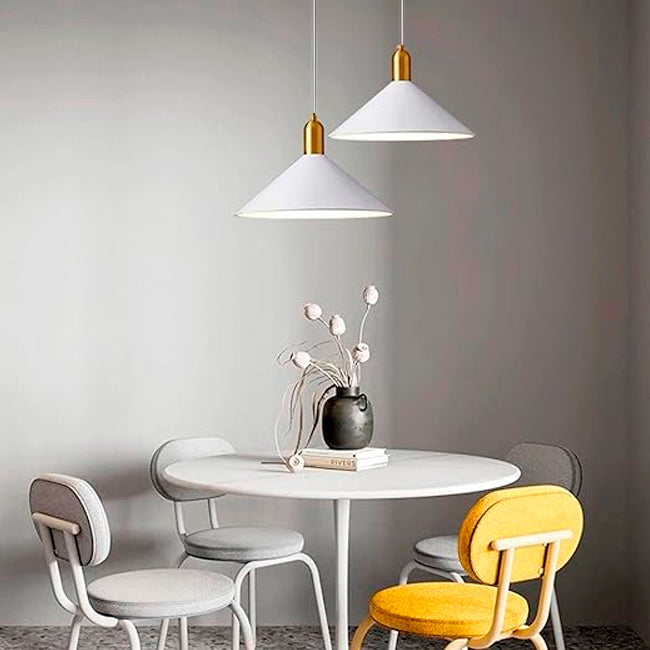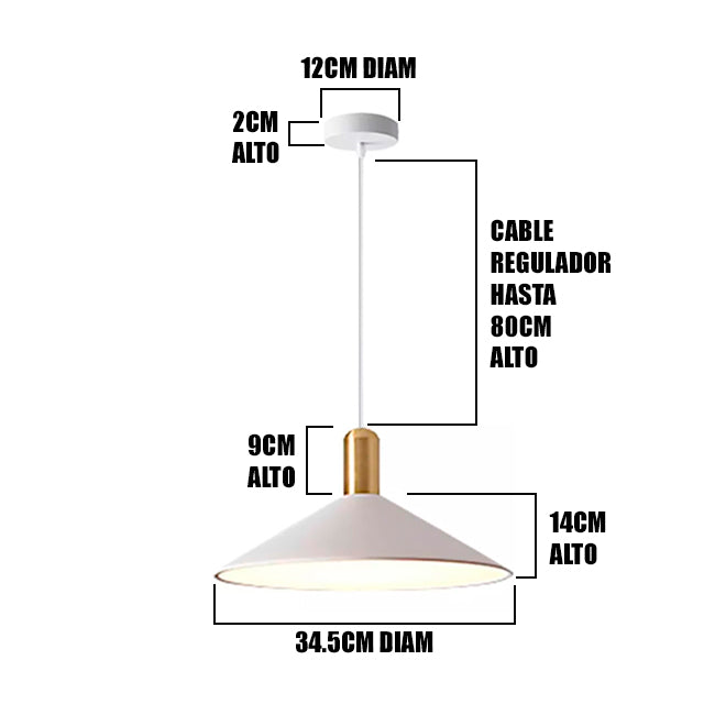 La Lámpara Colgante Cali White and Gold es una opción ideal para quienes buscan diseño simple, moderno y funcional. Su estructura tipo campana en blanco mate, combinada con un elegante detalle dorado en la parte superior, crea un contraste atractivo que aporta calidez y estilo a cualquier ambiente. Funciona con foco de rosca E27 (no incluido), lo que permite personalizar la temperatura de color según el uso y la ocasión.