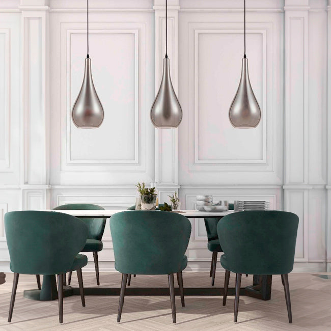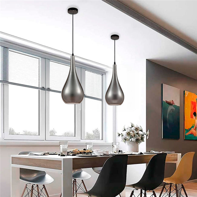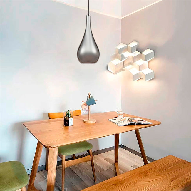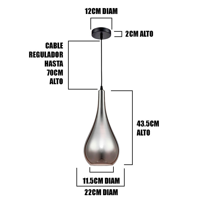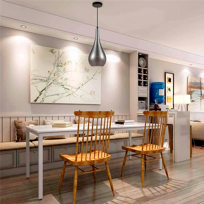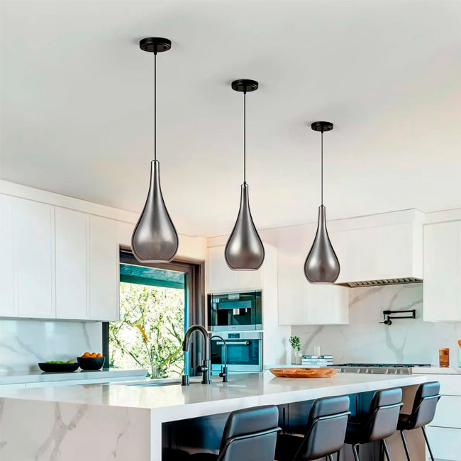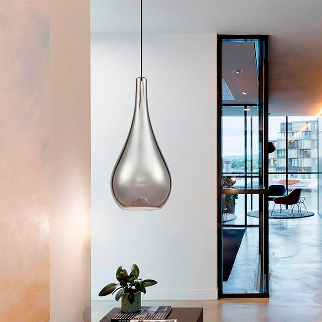 Con un diseño estilizado en forma de gota, la lámpara Rebeca Smoke Gray aporta distinción y elegancia a cualquier espacio. Su delicado cuerpo de vidrio en tono gris ahumado genera una luz cálida y acogedora, ideal para ambientes que buscan sofisticación y calidez.