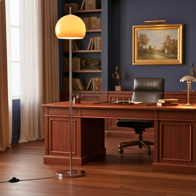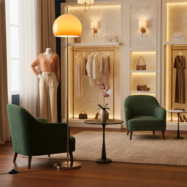 La lámpara de pie Kiara Silver LED es una pieza moderna y elegante que fusiona funcionalidad y diseño. Su estructura metálica cromada y su pantalla en acabado ámbar generan una iluminación cálida y sofisticada, ideal para complementar cualquier espacio con un toque de distinción.