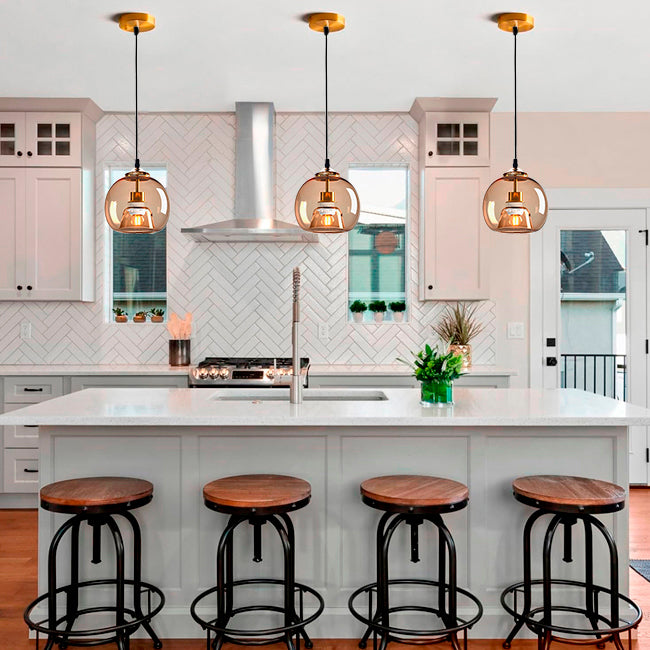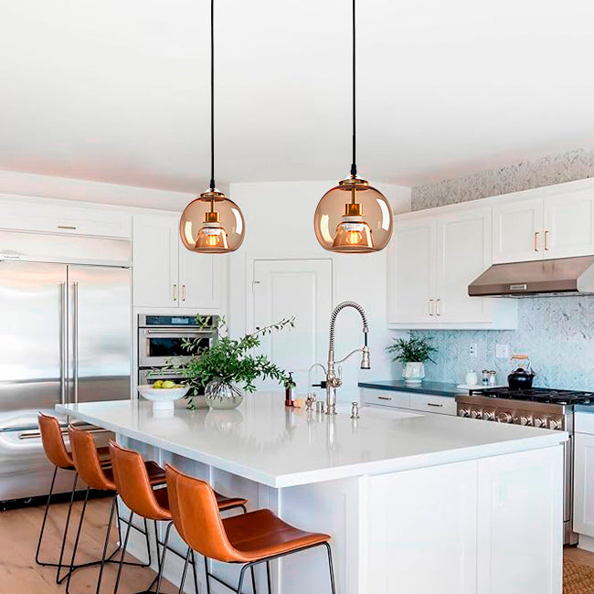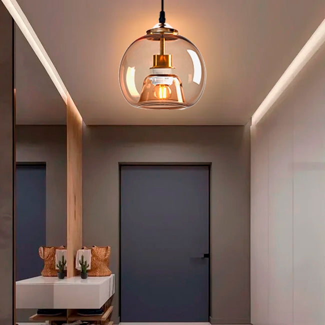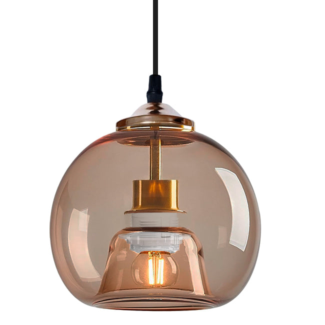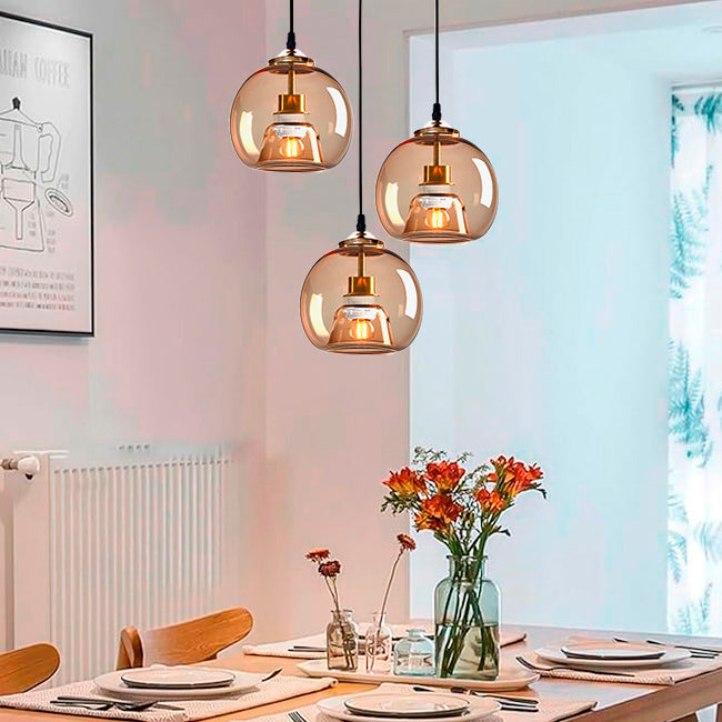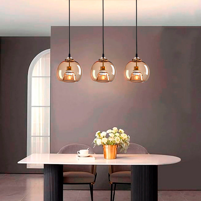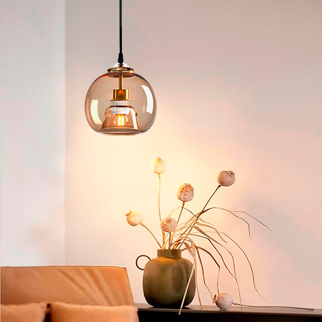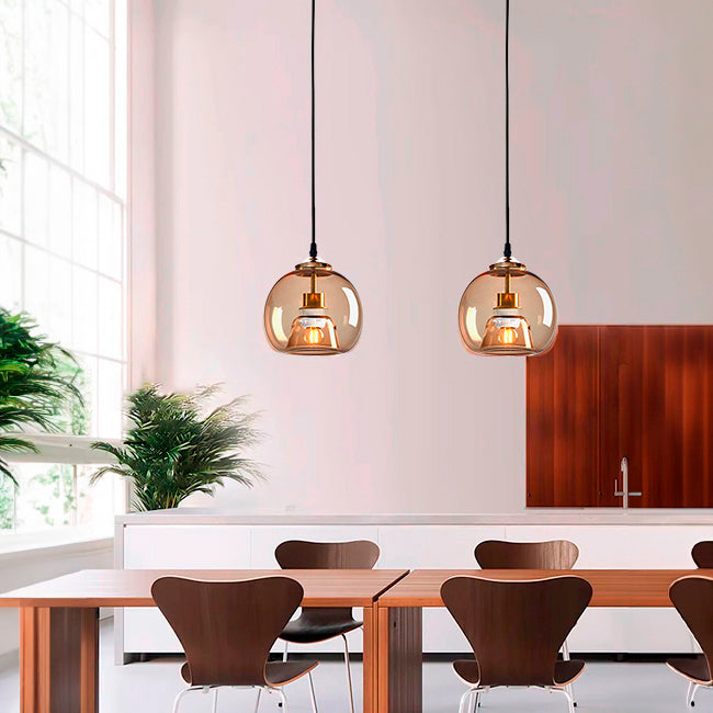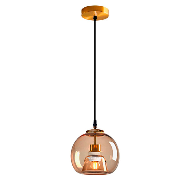 La Lámpara Colgante Jersey Ámbar aporta calidez y estilo a cualquier espacio con su diseño tipo burbuja de vidrio ámbar traslúcido. Su forma redondeada suaviza la iluminación y crea una atmósfera envolvente, mientras que su estructura en dorado electroplated realza su elegancia. Funciona con foco E27 (no incluido), lo que permite personalizar la luz según el entorno.