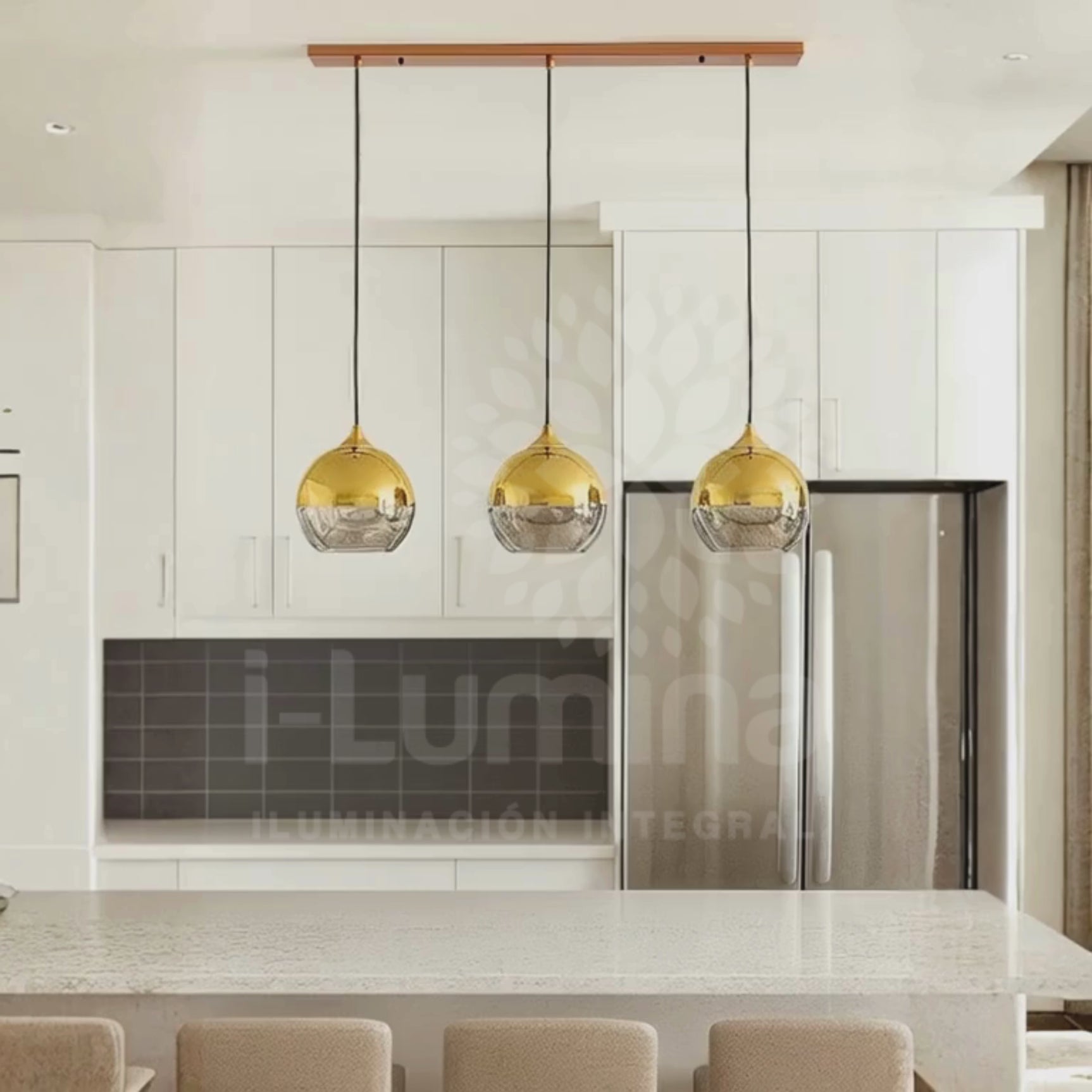 La lámpara colgante Trío Vanila Gold combina elegancia y modernidad en un diseño ideal para comedores, barras o cocinas de estilo contemporáneo. Sus tres pantallas esféricas metálicas con acabado dorado reflejan la luz de forma cálida y sofisticada, creando un ambiente acogedor y decorativo. Incluye 03 focos LED transparentes A60 de 4W en luz cálida, perfectos para destacar el brillo del dorado y aportar un toque de confort visual. Su cable regulable permite ajustar la altura hasta 100 cm, adaptándose a distintos tipos de techos y ambientes.