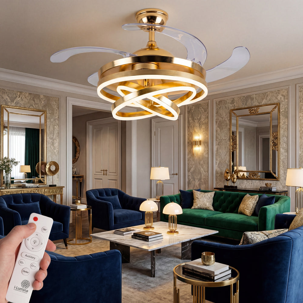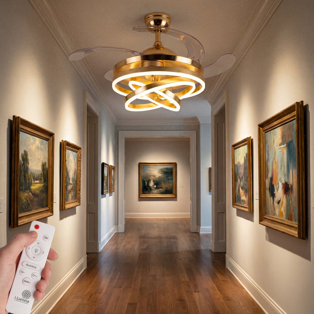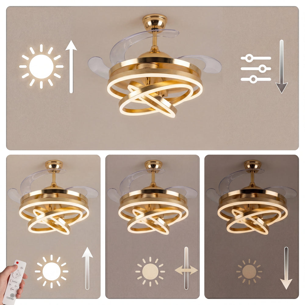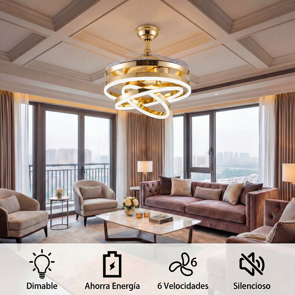 A diferencia de los ventiladores convencionales, este modelo presenta 3 círculos de luz LED que puedes configurar según tus propias necesidades, permitiéndote crear una pieza visual única que se adapta a tu estilo. Su acabado en dorado satinado y su pantalla de acrílico de alta transmitancia garantizan una luz suave, uniforme y elegante.
