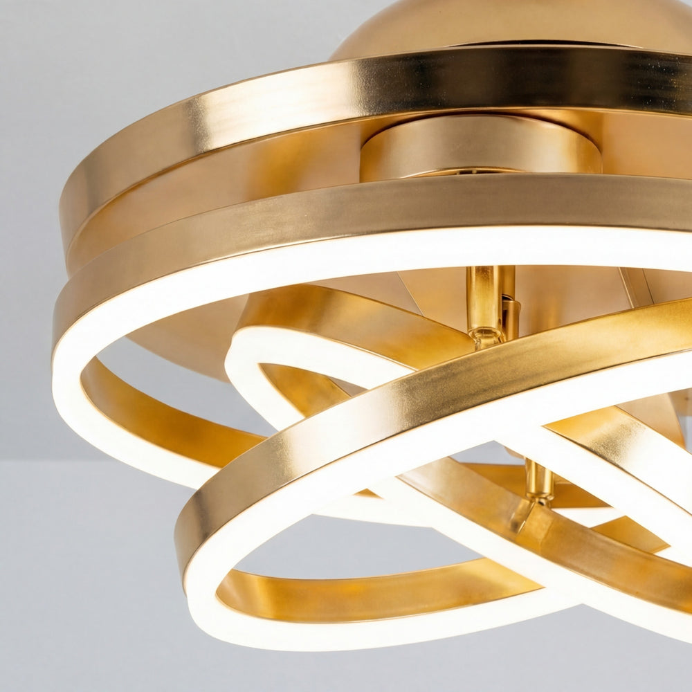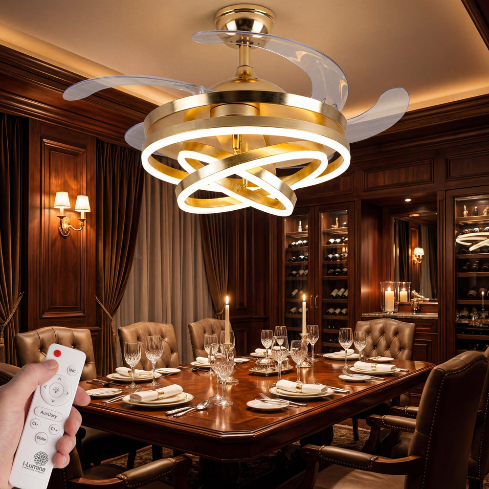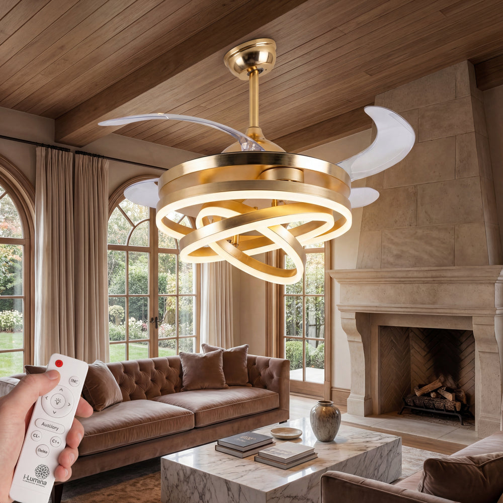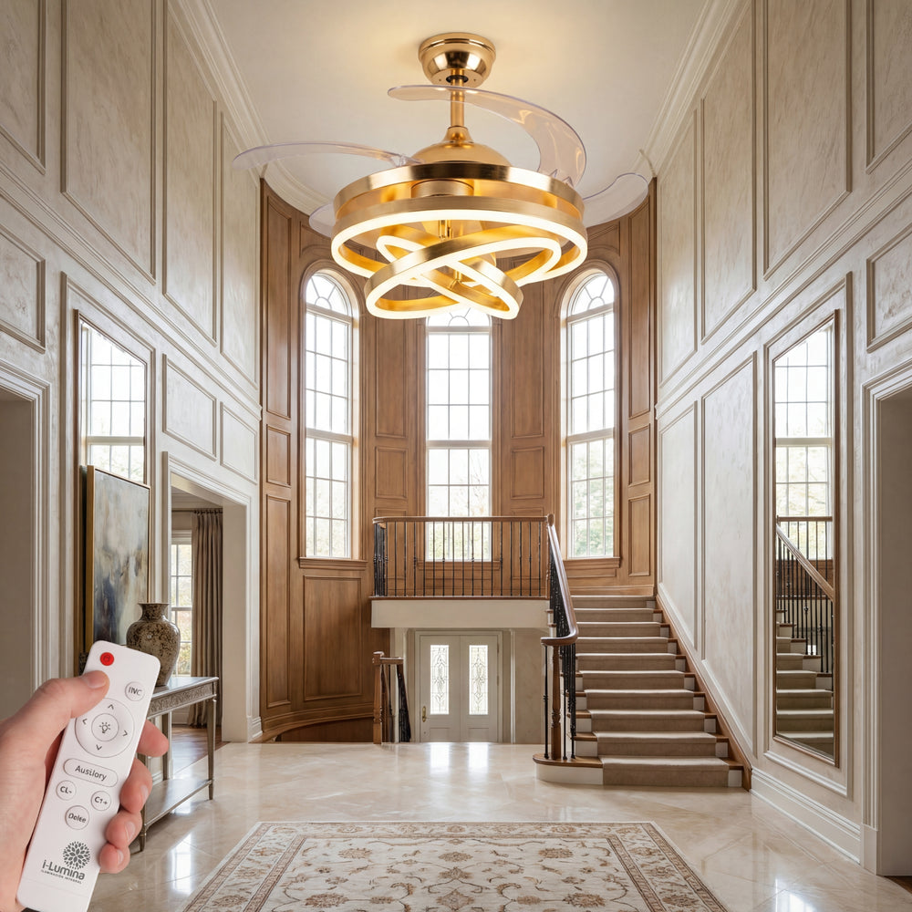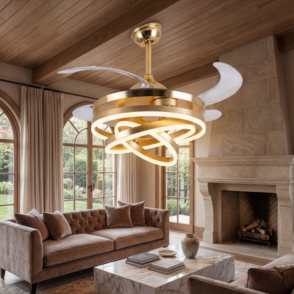 A diferencia de los ventiladores convencionales, este modelo presenta 3 círculos de luz LED que puedes configurar según tus propias necesidades, permitiéndote crear una pieza visual única que se adapta a tu estilo. Su acabado en dorado satinado y su pantalla de acrílico de alta transmitancia garantizan una luz suave, uniforme y elegante.
