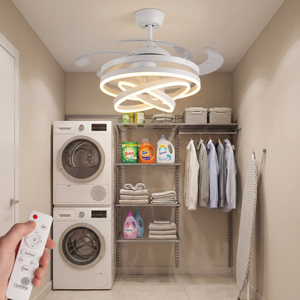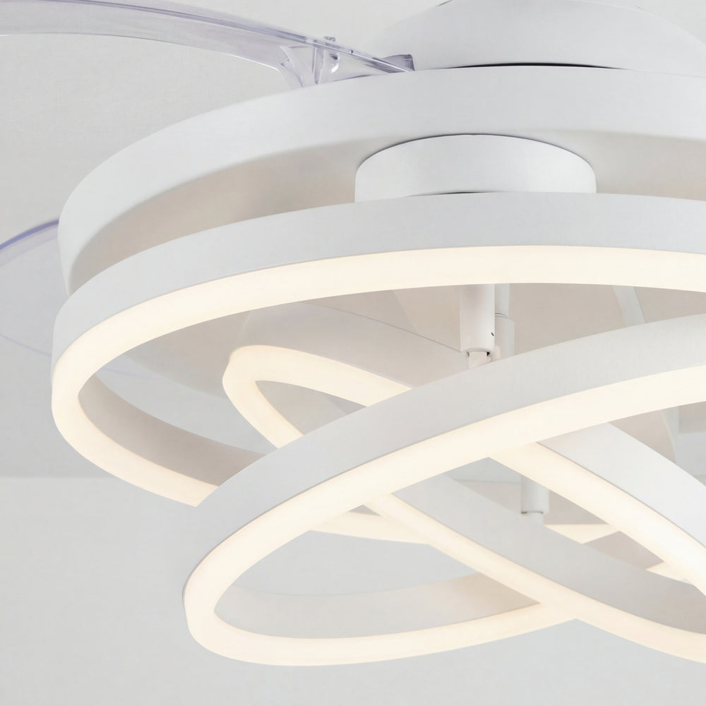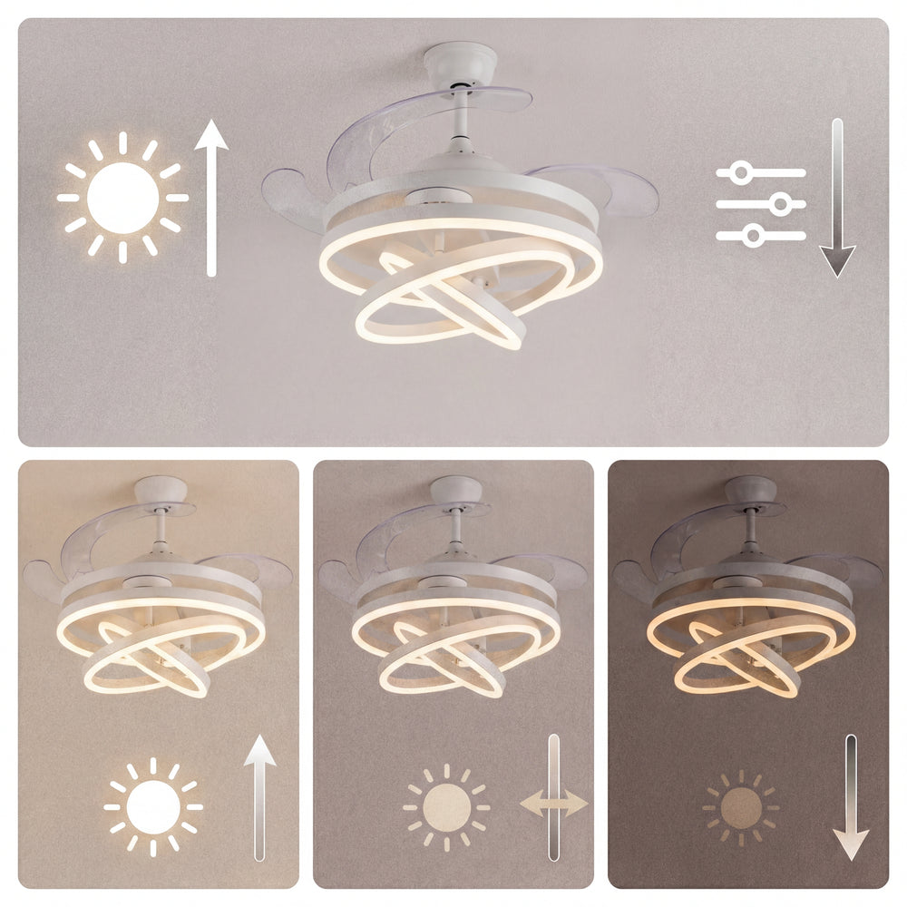 A diferencia de los ventiladores convencionales, este modelo presenta 3 círculos de luz LED que puedes configurar según tus propias necesidades, permitiéndote crear una pieza visual única que se adapta a tu estilo. Su acabado en blanco mate y su pantalla de acrílico de alta transmitancia garantizan una luz suave, uniforme y elegante.