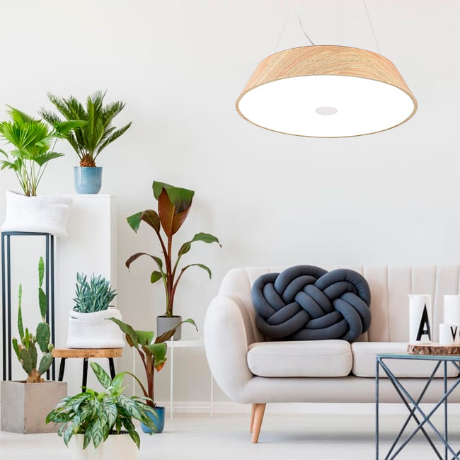 La lámpara colgante Bonnie LED Wood destaca por su estilo contemporáneo y su acabado cálido en tono madera natural. Su diseño elegante y funcional se adapta perfectamente a comedores, dormitorios o salas modernas. Equipada con tecnología LED de 50W y control remoto, permite ajustar tanto la intensidad como la tonalidad de la luz para crear ambientes acogedores o luminosos según la ocasión. Su suspensión con tres cables acerados y canopla de aluminio con acabado madera aportan un toque sofisticado y resistente al conjunto.