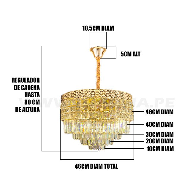 • Estilo glam clásico con estructura dorada y cristales colgantes tipo prismas facetados