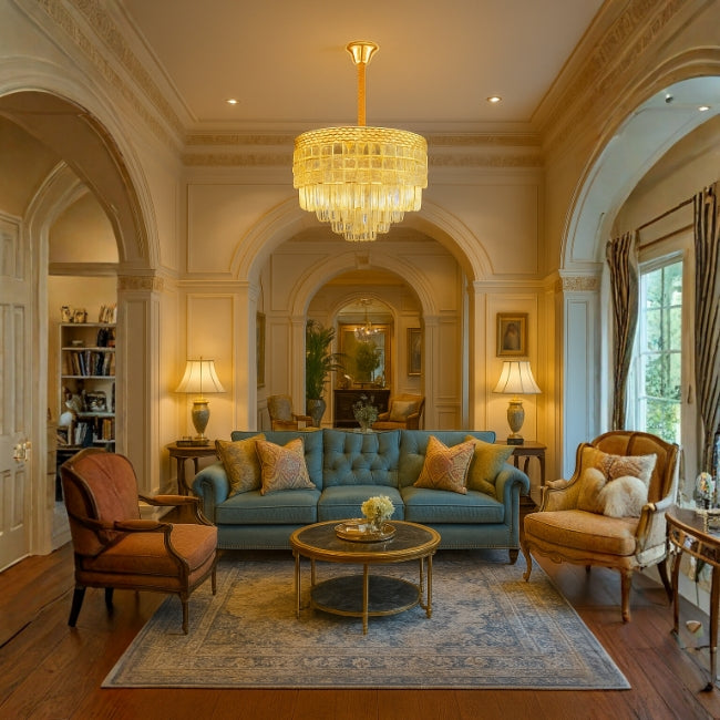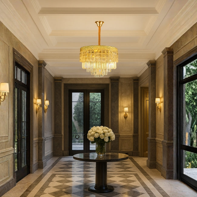 Perfecta para realzar comedores, salas principales, dormitorios sofisticados, vestíbulos, lobbies, boutiques, salas de reuniones o espacios de lujo que necesiten un punto focal con brillo elegante.