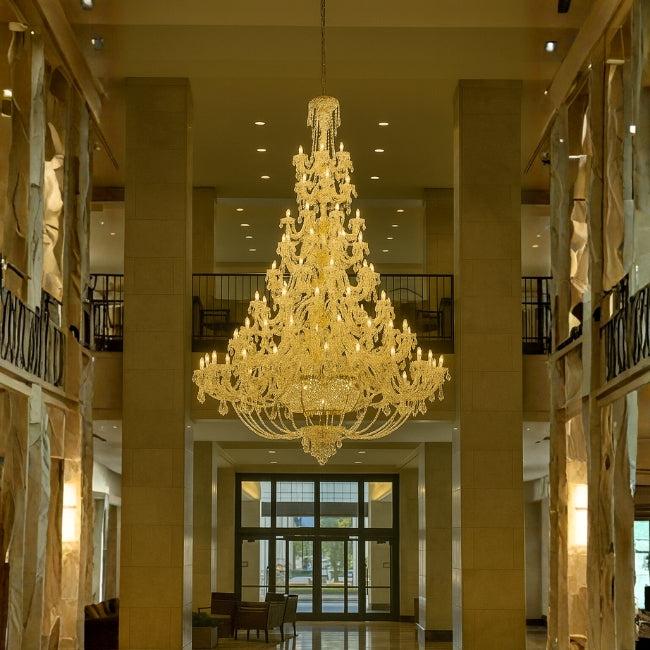 La lámpara colgante Krystal Wranovsky es una pieza monumental de lujo, diseñada para transformar ambientes de triple altura con una presencia visual imponente. Su diseño en forma de cascada escalonada distribuye armoniosamente 24 fuentes de luz, creando una atmósfera luminosa, cálida y majestuosa. Ideal para hoteles de alta gama, residencias exclusivas o salones de gala.