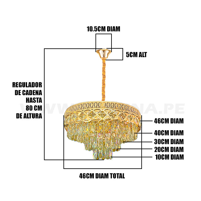 Su estructura dorada resalta el brillo de los cristales, mientras que su diseño en capas genera un juego de luces cautivador. Perfecta para realzar salas, comedores, recibidores o espacios que buscan un toque distintivo.