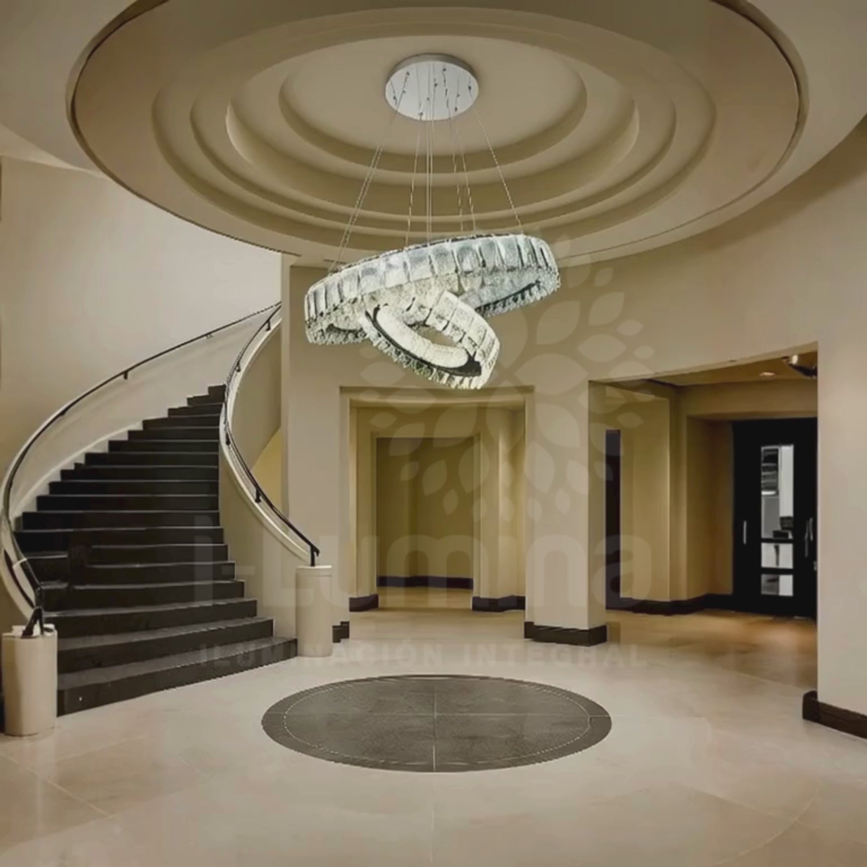 Transforma tu espacio con elegancia y movimiento. La lámpara colgante DENIZ KRYSTAL combina diseño moderno con detalles en cristal facetado que realzan cualquier ambiente. Su forma de doble aro entrelazado genera una sensación visual dinámica y lujosa, ideal para techos altos y espacios con carácter.