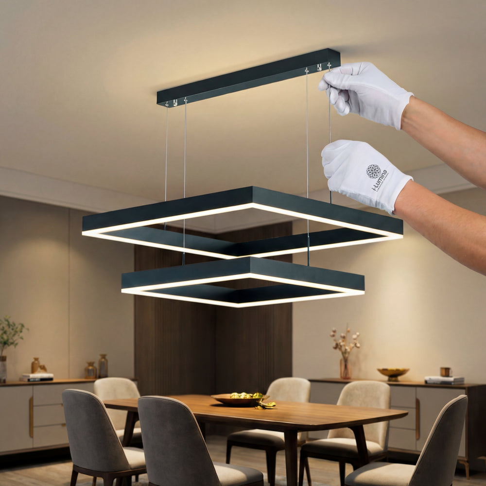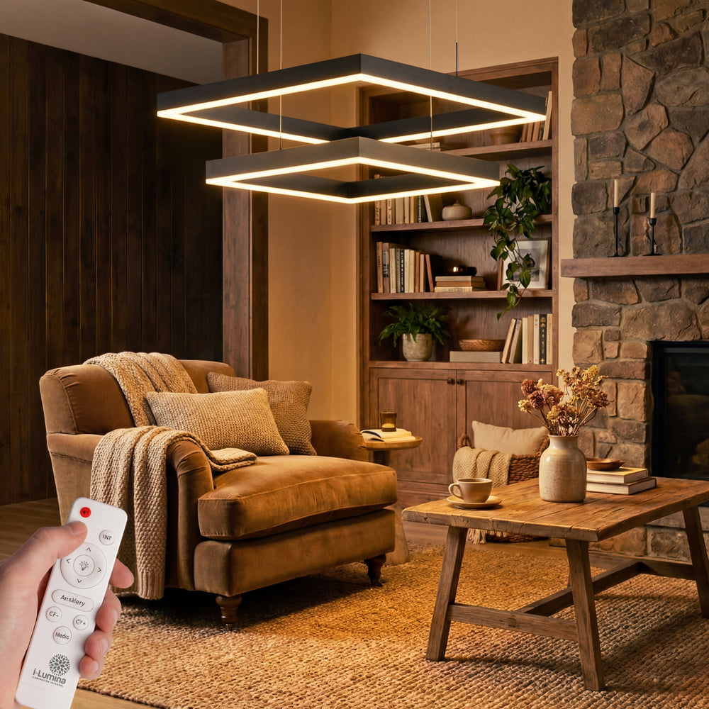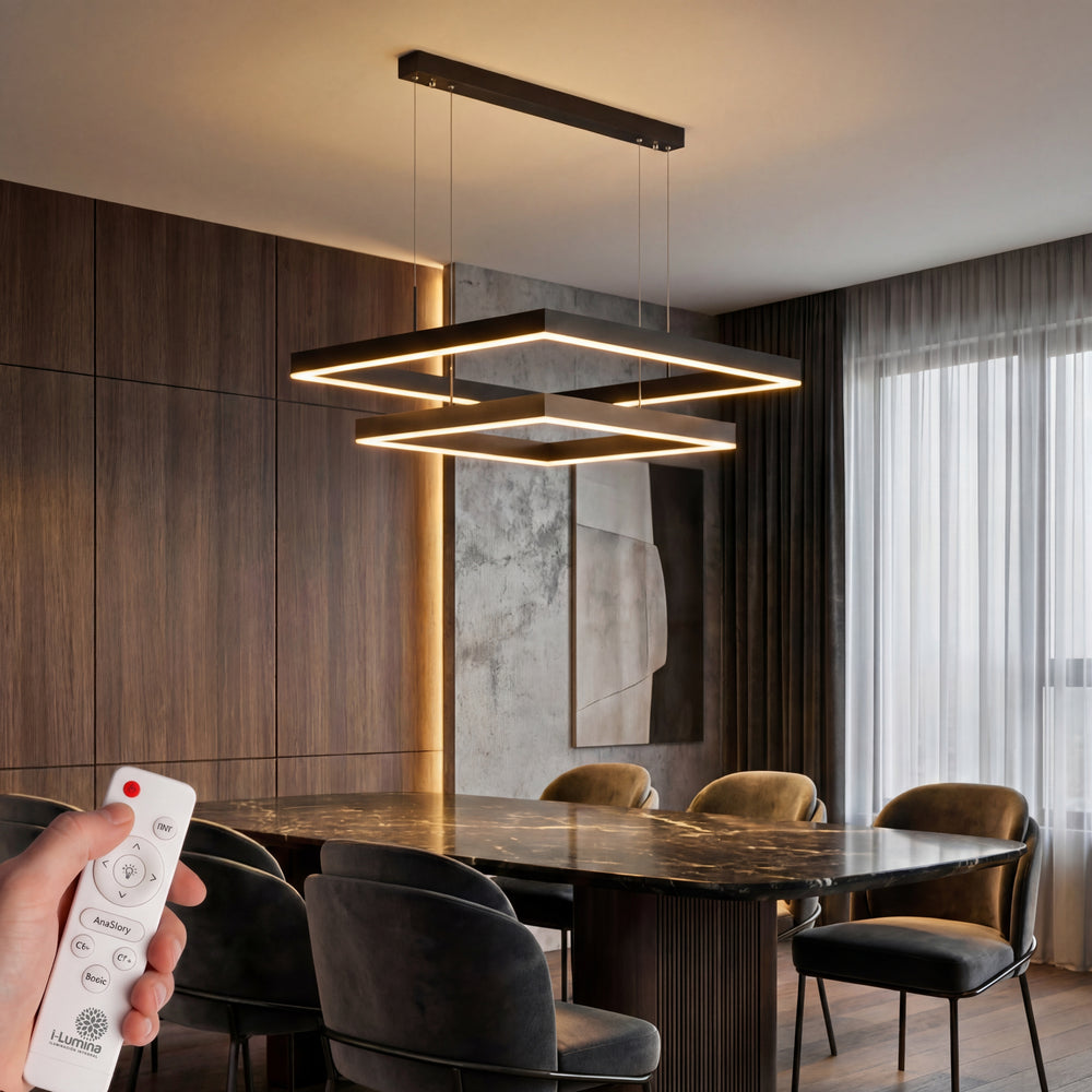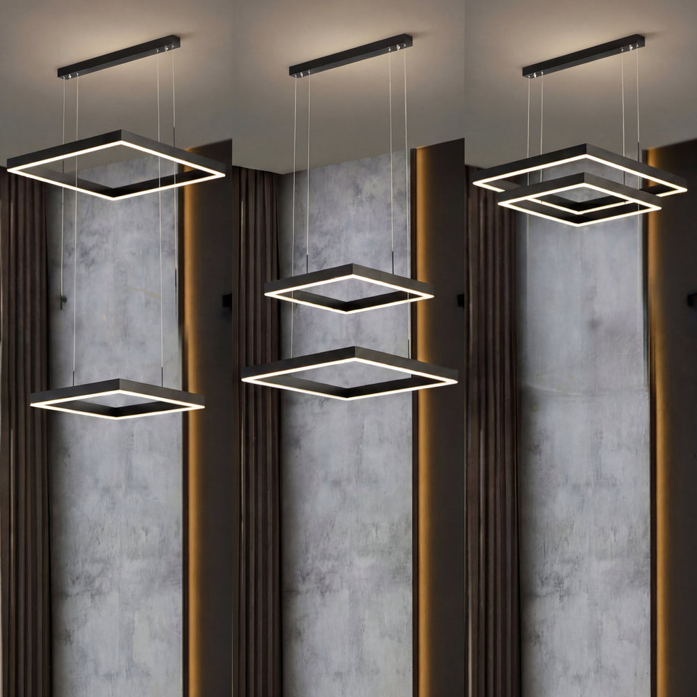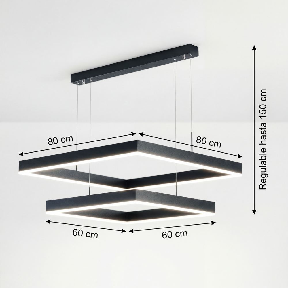 Transforma tus espacios con la Lámpara Colgante LED Square Dual, una pieza de iluminación arquitectónica diseñada para quienes buscan romper con lo convencional. Su estructura de doble marco cuadrado en niveles crea un efecto visual de profundidad y ligereza, convirtiéndose en el punto focal de cualquier salón, comedor o lobby de oficina.