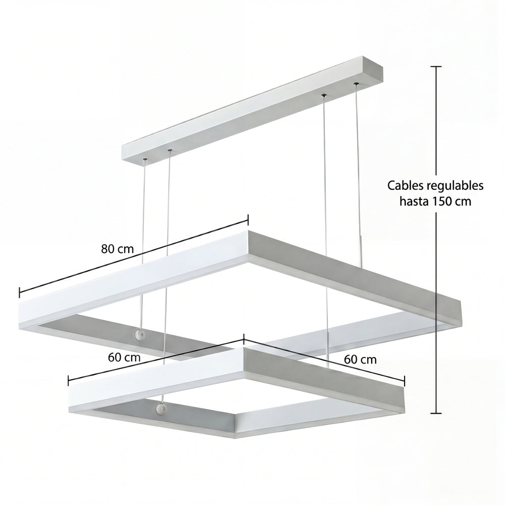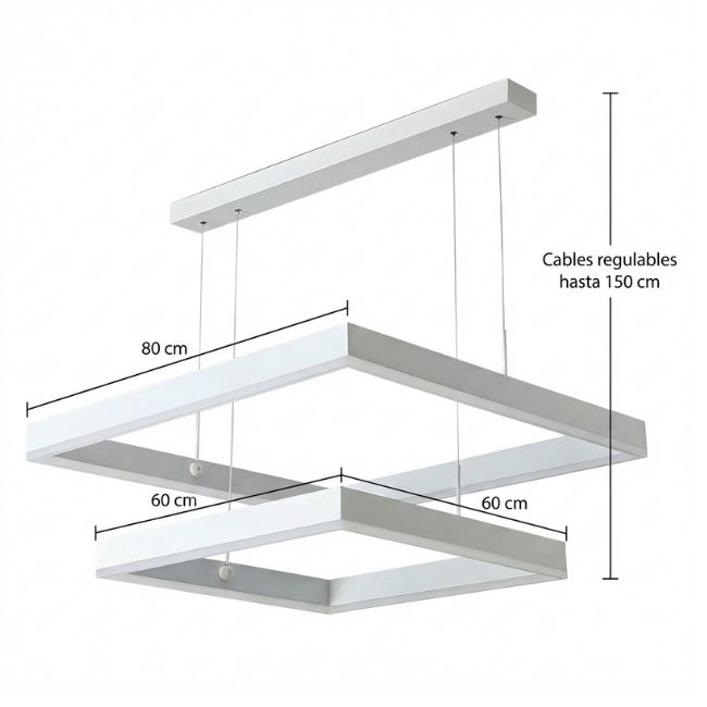 • Diseño de Doble Nivel: Sus dos estructuras geométricas suspendidas ofrecen una iluminación equilibrada y un estilo minimalista que encaja perfectamente con techos altos y ambientes amplios.