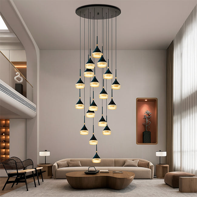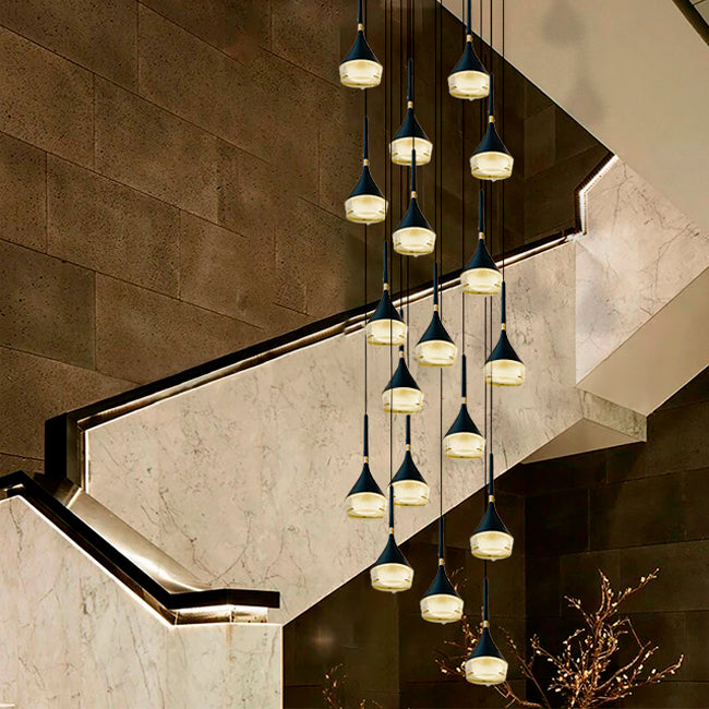La Lámpara Colgante Andrea Black and Gold es una pieza de alto impacto visual diseñada para realzar espacios de doble altura. Su estructura compuesta por 18 luces en caída tipo cascada combina elegancia y modernidad con acabados en negro mate y detalles dorados. Cada punto de luz emite una cálida iluminación LED regulable, que puedes ajustar cómodamente con el control remoto incluido. Perfecta para vestíbulos, escaleras principales o espacios residenciales sofisticados.