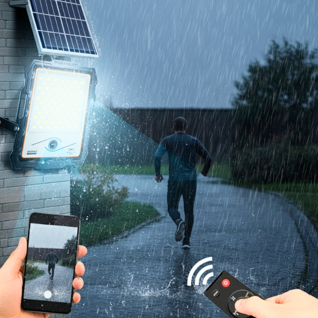 REFLECTOR LED 100W + CÁMARA INTEGRADA + PANEL SOLAR LUZ BLANCA 7500K + CONTROL REMOTO