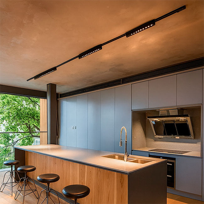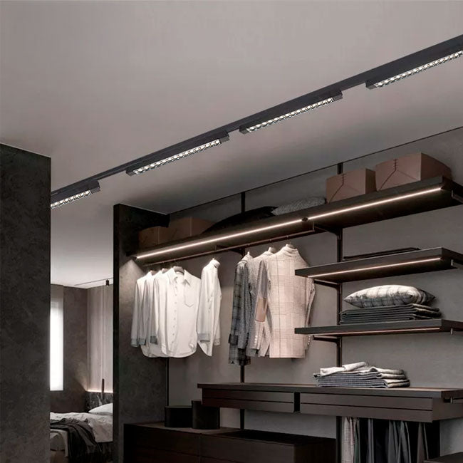 El Spot LED Grilla Black para Riel de 30W de CEM, distribuido por ILUMINA, es una solución de iluminación de acento moderna y altamente eficiente, ideal para tiendas, galerías de arte y vitrinas en Perú. Este cabezal incorpora una grilla de 15 LEDs que, en conjunto, emiten 2400 lúmenes de una confortable Luz Cálida (3000K). Su diseño lineal y acabado negro mate se integra perfectamente en rieles, permitiendo dirigir el haz de luz con precisión (120°) para destacar productos, obras o elementos arquitectónicos.