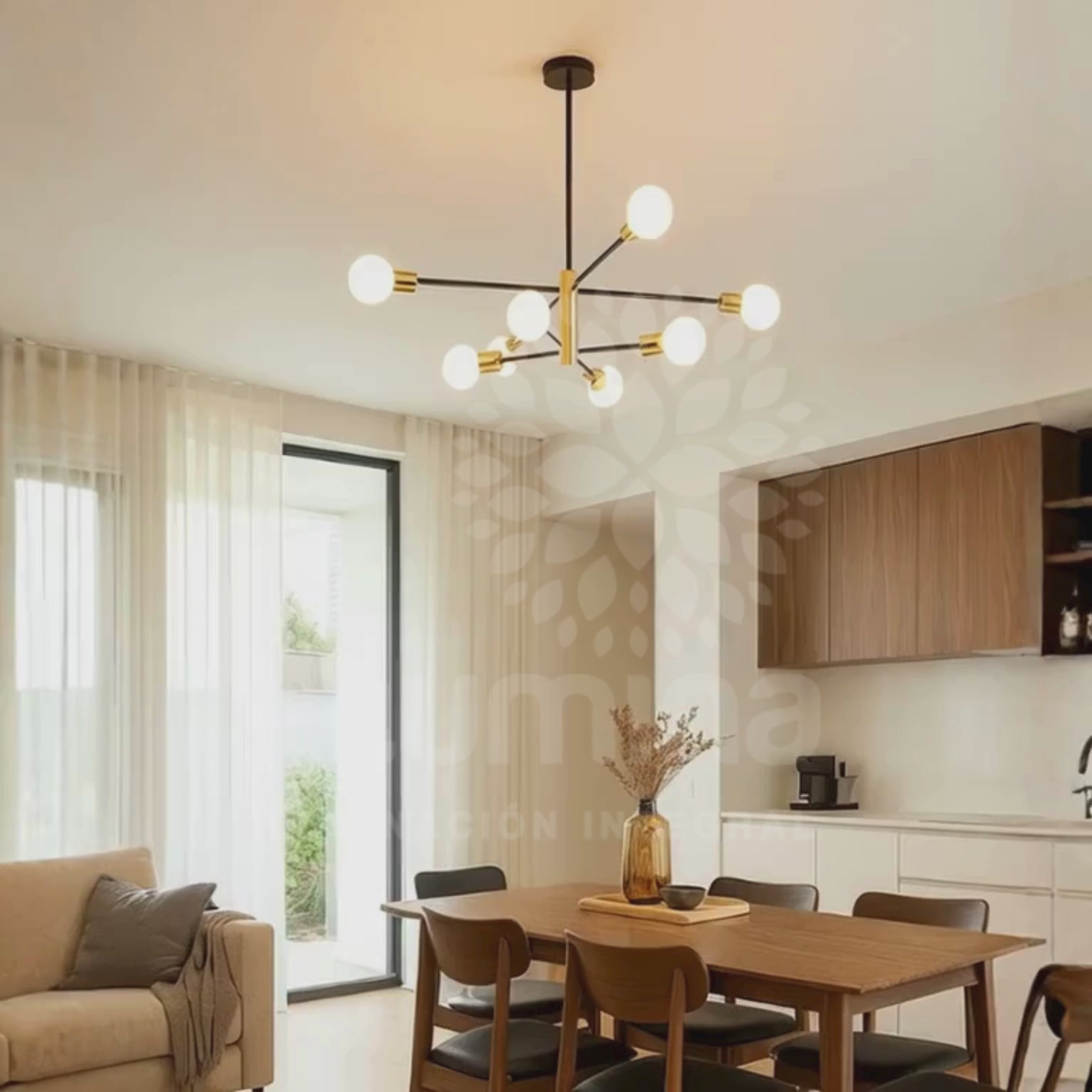 La lámpara colgante Olivia Black and Gold combina elegancia moderna y sofisticación industrial en una pieza única. Su estructura metálica en negro mate con detalles dorados crea un equilibrio perfecto entre diseño contemporáneo y estilo clásico. Con ocho puntos de luz distribuidos de forma armónica, proporciona una iluminación amplia y decorativa, ideal para realzar salas, comedores o ambientes de alto impacto visual.