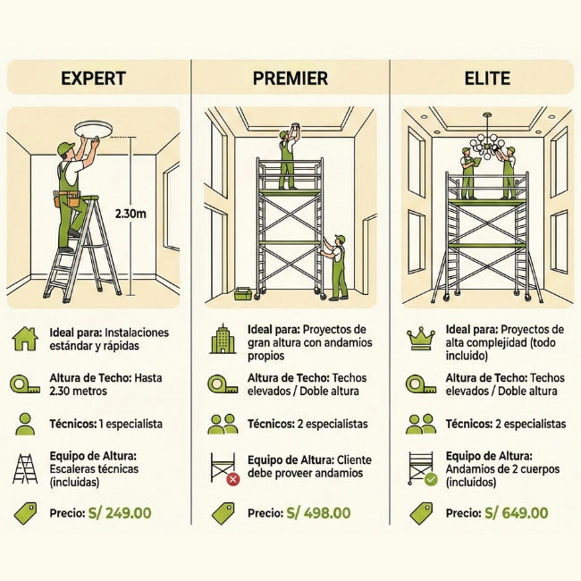 Facilita al técnido el uso de energía eléctrica. Si el trabajo a realizar es en doble altura, proporciona andamios o estructuras que permitan al técnico llegar al punto donde el producto será instalado.